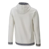 For example, the inside of the hood is in the colour navy and features a historic laurel leaf print. The pocket bag with piping is also in navy, as is the inside, which again features a historic laurel leaf print. The neckband is designed in the colour off-white, the hem and cuffs in a fine 1 x 1 rib with knitted-in stripes in navy. A historic star print on the front completes the sporty, casual look.