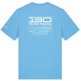 Blauw T-shirt met een „130 Years Trucks“-grafiek op de achterkant, de Mercedes-Benz Trucks-tekst op de linkermouw en de ster op de linkerborst.