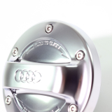 Originele Audi brandstofdop in aluminiumlook, versierd met Audi-ringen.
